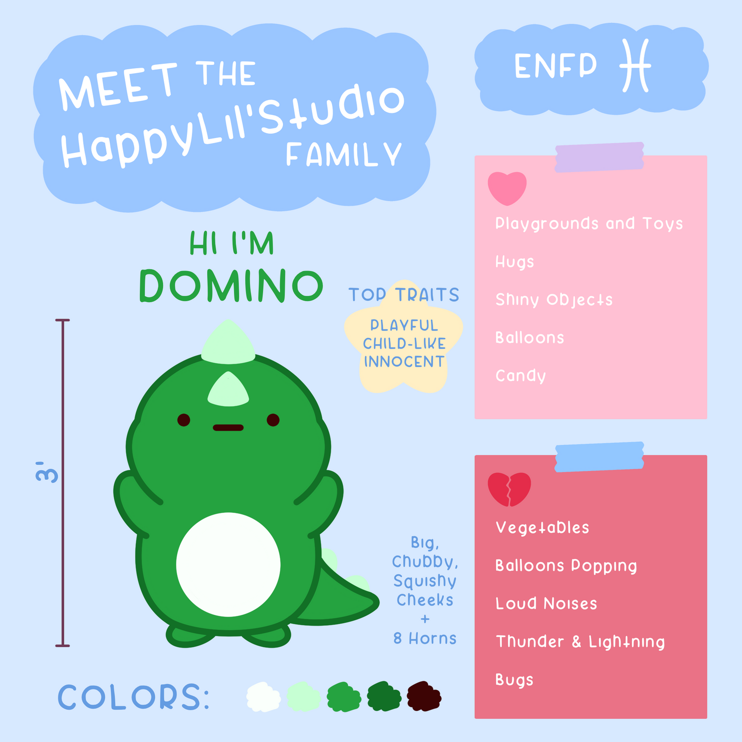 Although he stands with his big body and tall stature, there's no need to worry. He's the baby of the HappyLil'Studio universe. He loves toys, balloons, and candy and runs away and hides from creepy crawlers and loud noises.